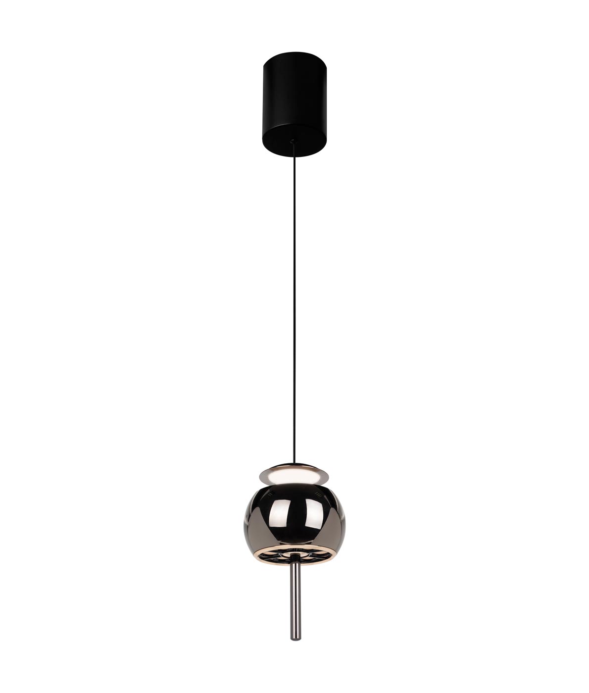 Lámpara de techo modelo Roller. Se puede ajustar la altura para subir y bajar manualmente. Acabado en color cromo y negro. Fabricado en aluminio y metal. Voltaje 220-240V y fuente de luz cálida LED 12W 3000K 450Lm (incluida).