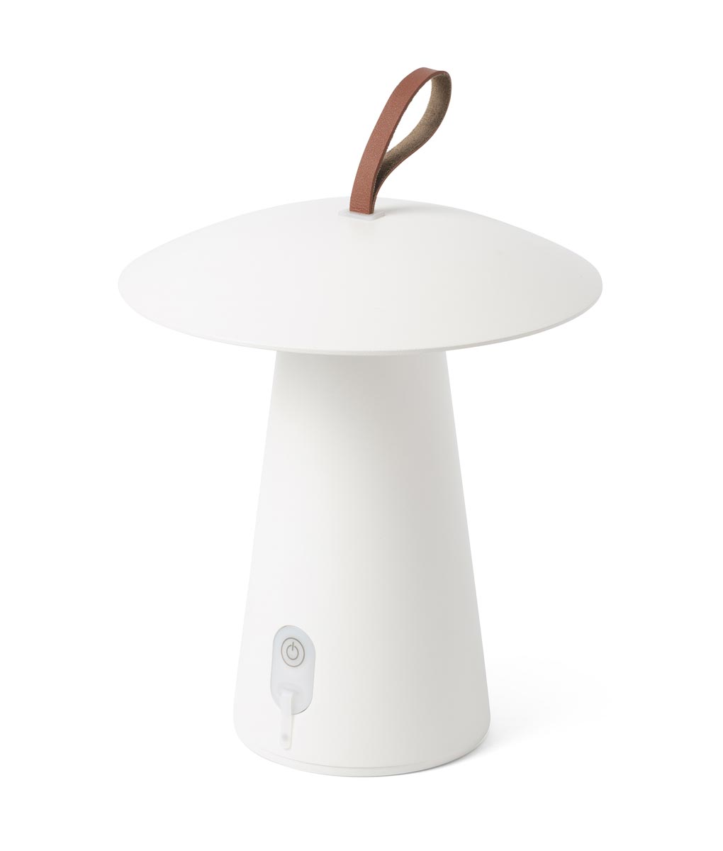 Lámpara transportable portátil de diseño moderno con alta protección IP54, modelo TASK LED. Asa de cuero para facilitar su transporte. Acabado en color blanco. Fabricada en aluminio y difusor PC. Recarga con un cable mini USB (incluido) completa en 4-5 horas. Fuente de luz cálida y regulable en tres intensidades LED 3000K 263Lm (incl.).