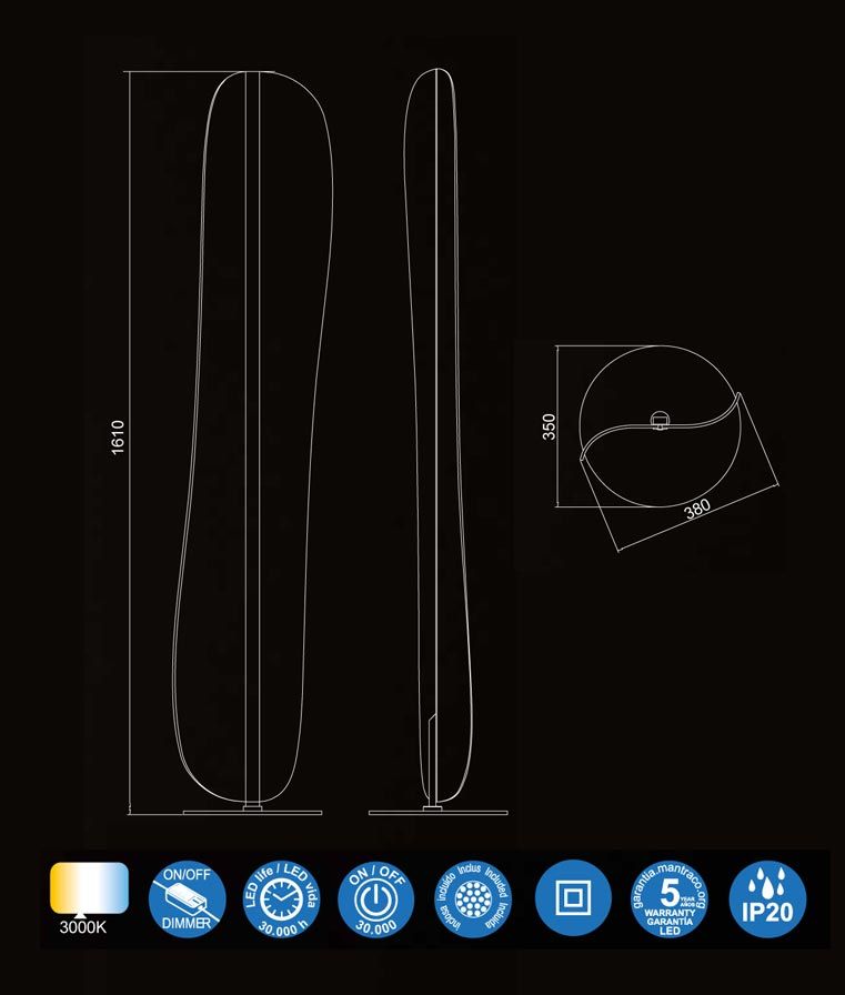 Lámpara de pie dimable, modelo BIANCA LED. Ideal para la iluminación decorativa. Acabado en color blanco. Fabricada en metal y acrílico. Voltaje 220-240V y fuente de luz cálida regulable en intensidad LED 30W 3000K 1800Lm (incluidas).