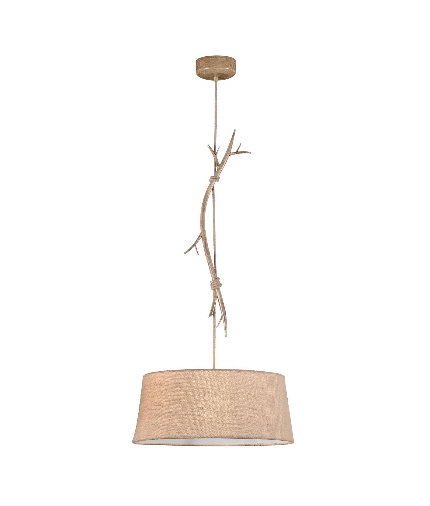 Lámpara colgante grande modelo SABINA. Acabado en color efecto madera y marrón claro. Diseño estilo rústico, ideal para la iluminación decorativa en ambientes de montaña y playa con carácter ibicenco. Fabricada en metal y pantallas textil. Voltaje 220-240V y fuente de luz 1 x E27 MAX 40W (no incl.).