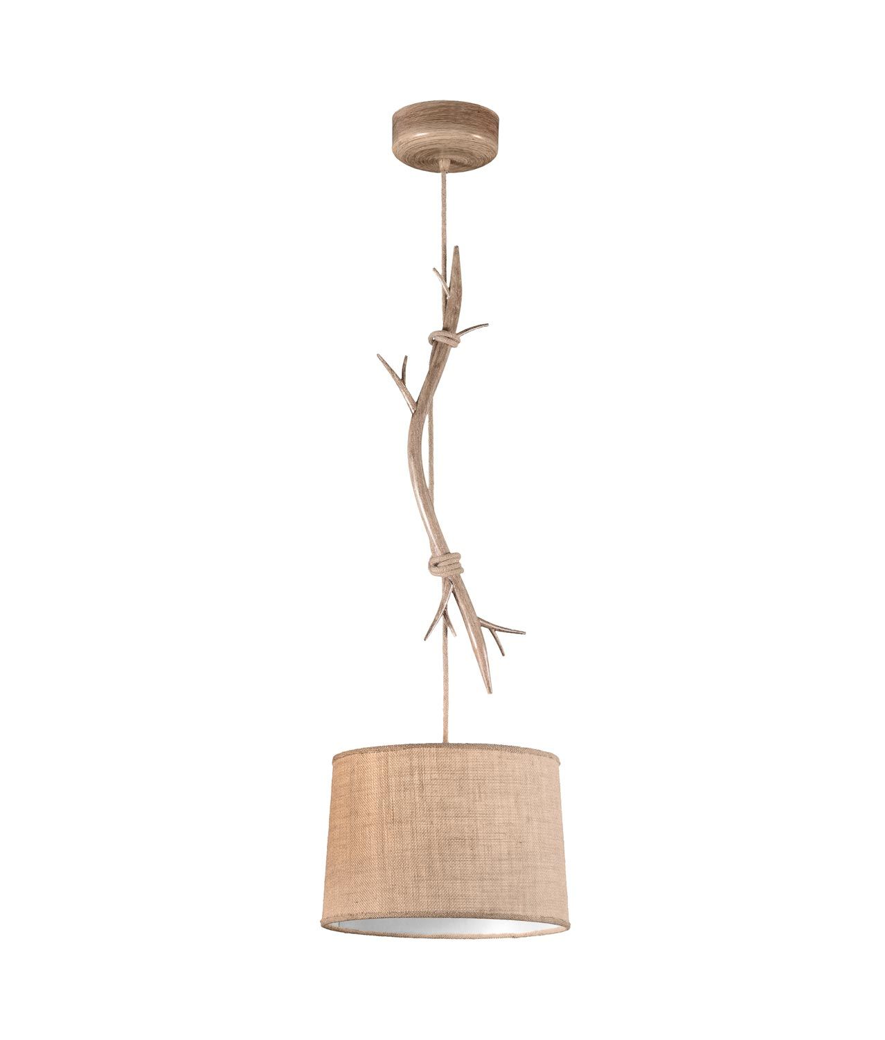 Lámpara colgante modelo SABINA. Acabado en color efecto madera y marrón claro. Diseño estilo rústico, ideal para la iluminación decorativa en ambientes de montaña y playa con carácter ibicenco. Fabricada en metal y pantallas textil. Voltaje 220-240V y fuente de luz 1 x E27 MAX 40W (no incl.).