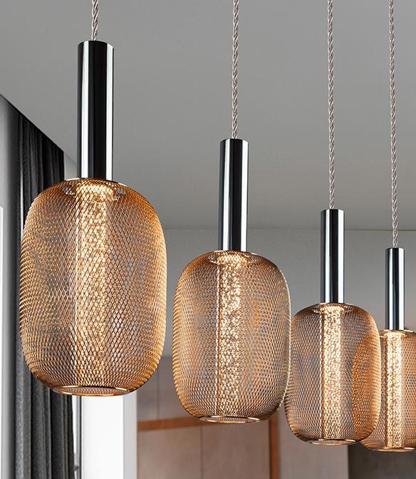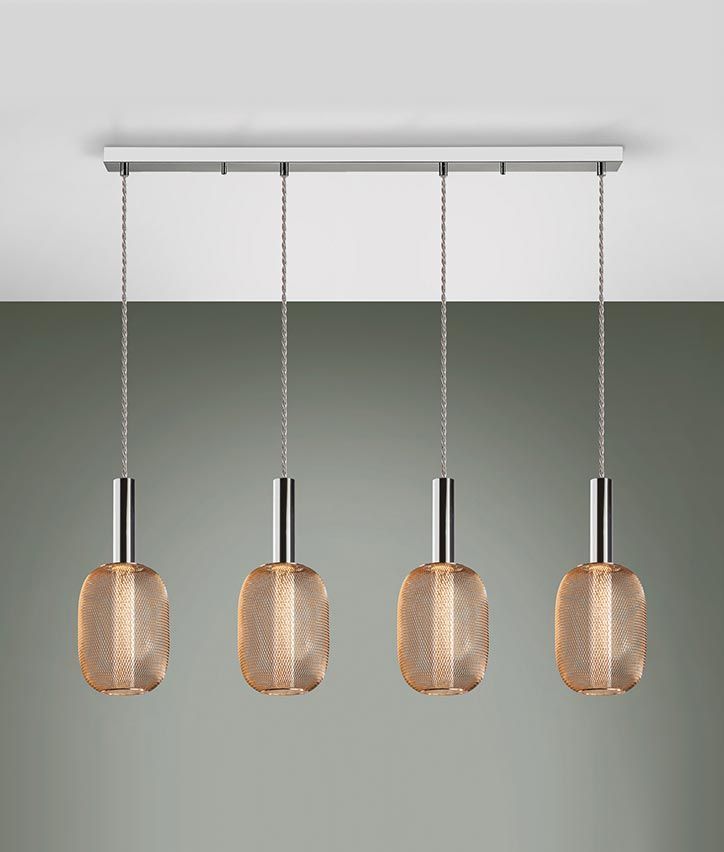 Lámpara de techo moderna con 4 luces, modelo MICRÓN. Ideal para la iluminación decorativa de interiores. Fabricado en metal cromado con doble tulipa con cilindro interior con burbujas y óvalo exterior de malla metálica oro brillo. Fuente de luz cálida regulable LED 20W 3000K 1800Lm (incluida). Voltaje 220-240V.
