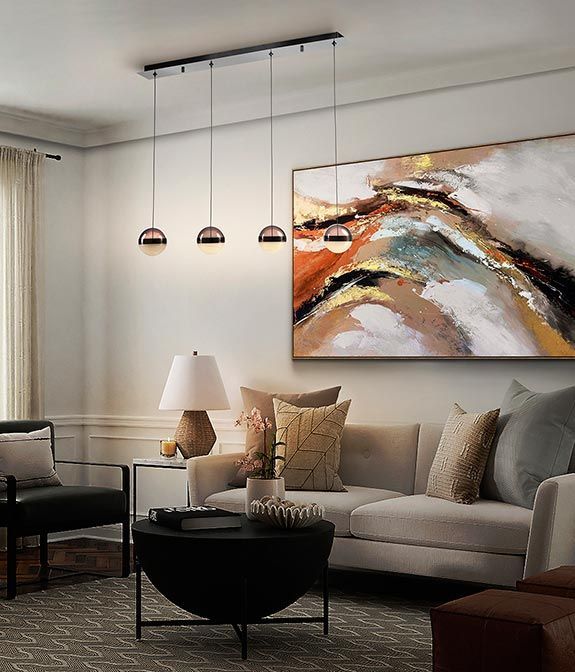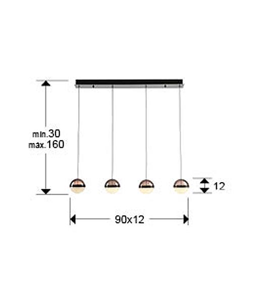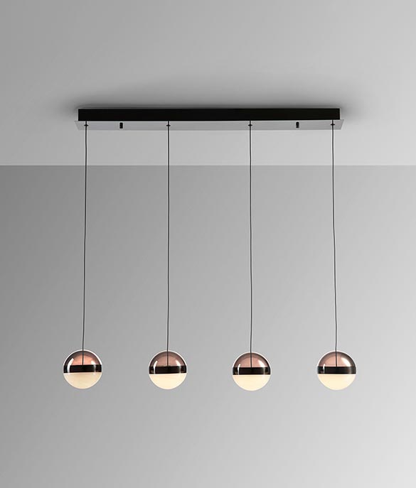 Lámpara de techo lineal con 4 colgantes de 12 cm diámetro modelo Orbes. Acabado en color negro, con aro de metal acabado cromo negro. Fabricada en metal, policarbonato y cristal marmolado. Voltaje 180-240V y fuente de luz LED 29W luz cálida 3000K 1304Lm dimable (incluida). 50.000 horas de vida media. Este producto incluye drivers led con dimado de tipo TRIAC y 0-10V. Puede dimar usando un regulador de pared tipo TRIAC o 0-10V. · Esta lámpara incluye TACOS DE VUELCO CON BALANCÍN, para mejorar la fijación a techo.