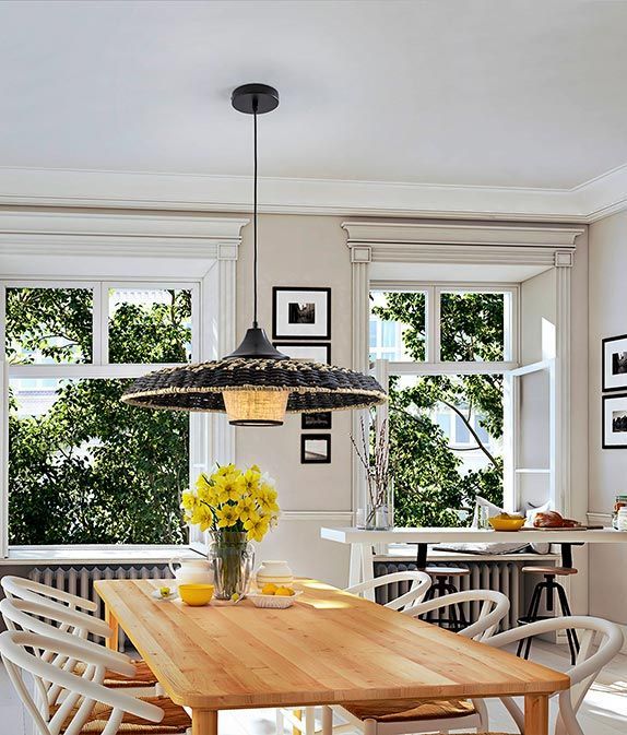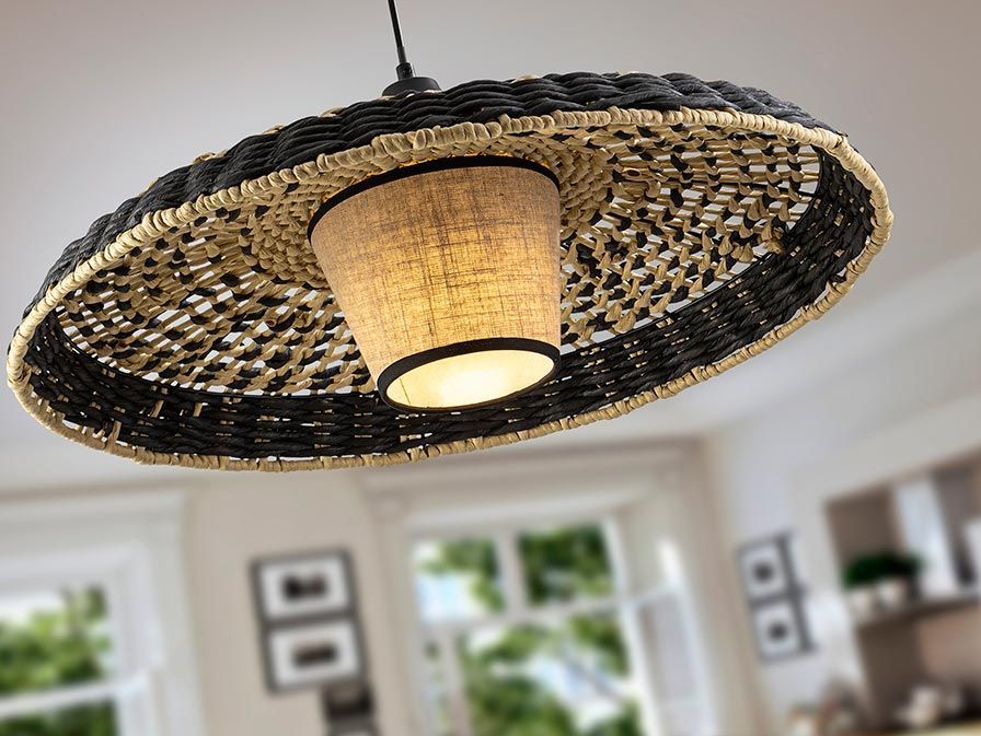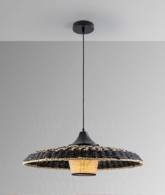 Lámpara de techo con pantalla doble de cuerda de papel trenzada y pantalla textil modelo Fiji. Acabado en color negro y beis. Fabricada en metal, cuerda de papel y pantalla textil. Voltaje 110-220V y fuente de luz por 1 bombilla x E27 10W LED luz cálida 3000K 900Lm (incluida).