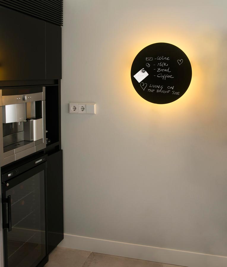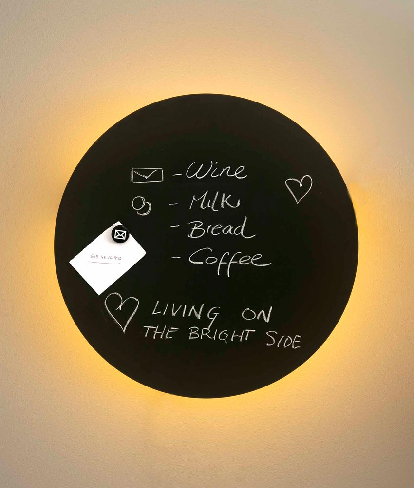 Lámpara aplique modelo BOARD LED. Su original base de pizarra de 35 cm de diámetro permite escribir y pintar sobre ella. Acabado en color negro. Diseño estilo moderno. Fabricada en pizarra y difusor PMMA. Voltaje 100-240V y fuente de luz cálida LED 7W 2700K 1280Lms (incl.).