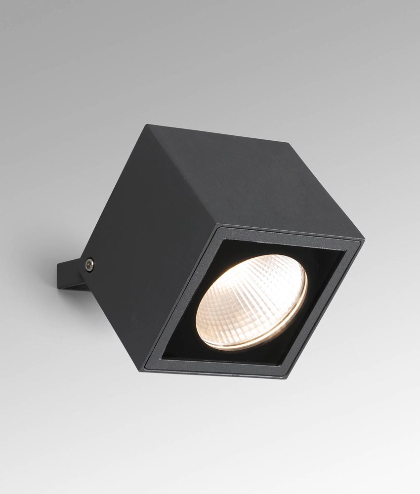 Aplique proyector de pared modelo OKO LED. Ideal luminaria para el exterior de balcones, jardines y terrazas con alta protección IP65 que lo protege contra la lluvia y los cuerpos sólidos. Acabado en color gris oscuro. Diseño estilo moderno. Fabricada en aluminio y difusor de cristal. Fuente de luz cálida COB LED 20W 3000K 1500Lms (incl.).