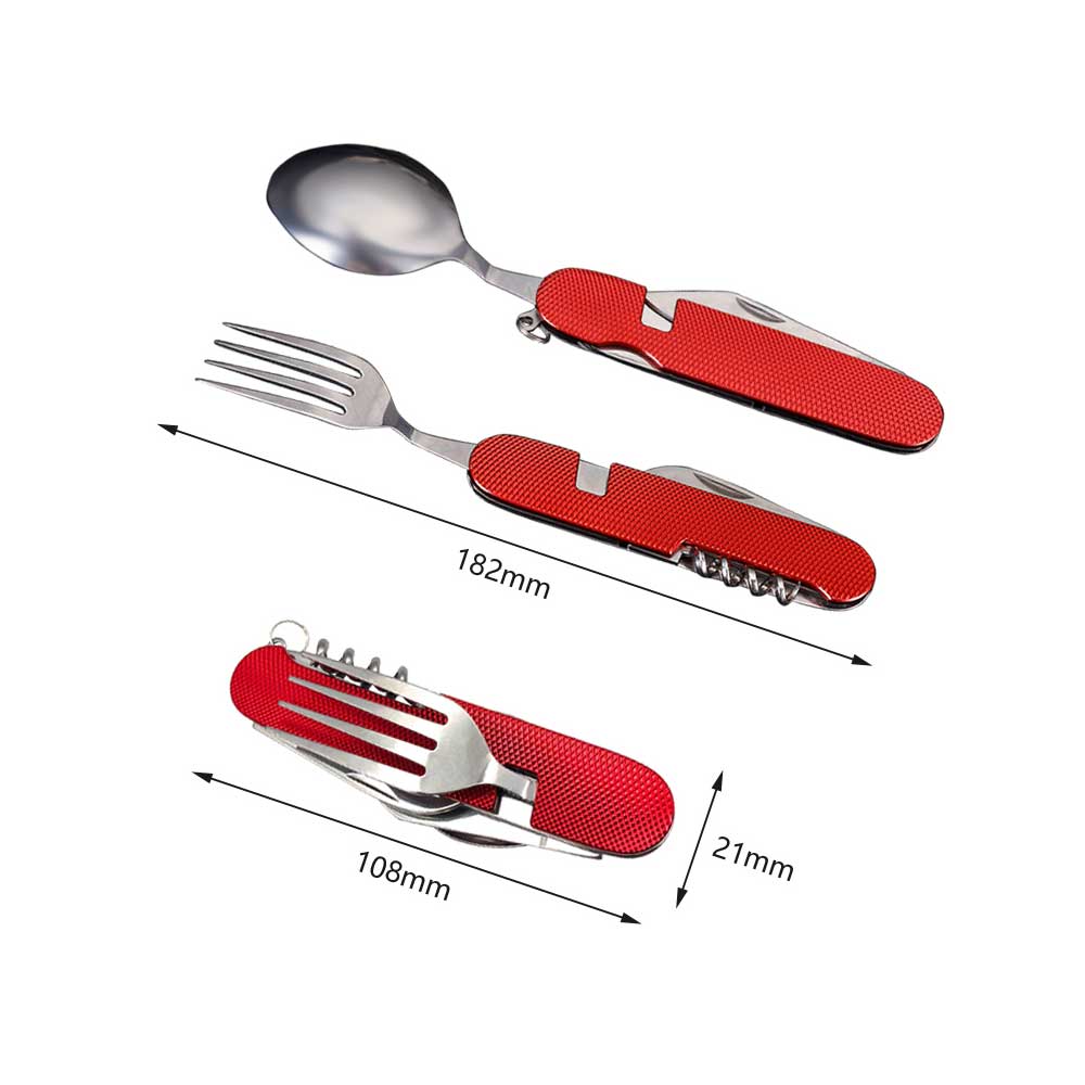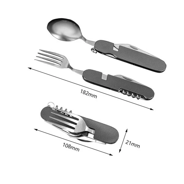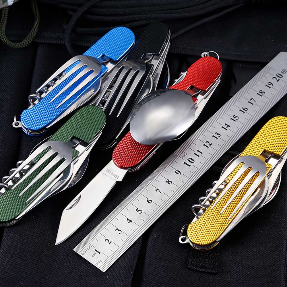 Múltiples funciones: 6 en 1 y amplia aplicación: el utensilio plegable de camping combina 6 herramientas en un solo kit, incluyendo cuchillo, tenedor, cuchara, abridor de botellas, sacacorchos, escariador, gran compañero para acampar al aire libre, pesca, caza, senderismo, exploración y EDC.