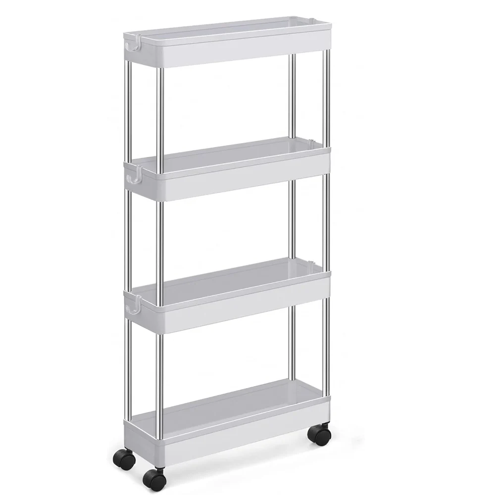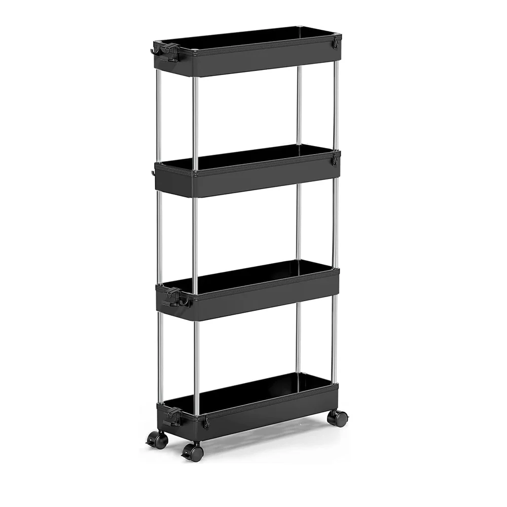 - Qué hay en la caja: Un carrito de 4 baldas con ruedas de espacio estrecho de calidad para un desplazamiento suave, 4 ganchos para colgar artículos pequeños, una buena ventilación y un aspecto elegante. El carrito delgado de 4 niveles se puede dividir en dos estantes de 2 niveles, o en una bandeja y un carrito de 3 niveles, para que pueda decidir si usarlos: en el lavabo para artículos de baño o en la encimera de la cocina para guardar botellas, ollas y sartenes