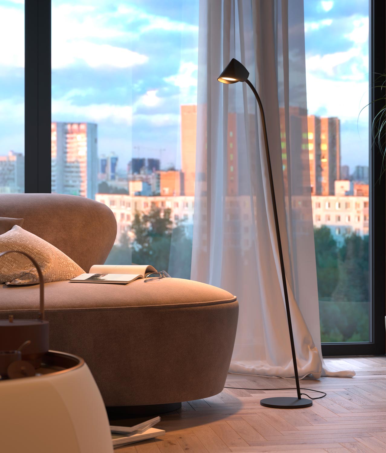 Lámpara de pie de diseño moderno, modelo CAPUCCINA LED. Ideal para la iluminación decorativa interior. Acabado en color negro. Fabricada en metal y aluminio. Voltaje 220-240V y fuente de luz cálida LED de 8,5W 3000K 600Lm (incluida).