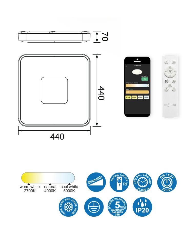 Plafón de techo modelo COIN. Control por mando a distancia y App móvil. Acabado en color negro. Fabricado en metal, ABS y acrílico. Voltaje 220-240V y fuente de luz regulable con tres estados (cálida, neutra y fría) LED de 80W 2700-5000K 3900Lm (incl.).
