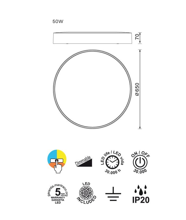 Plafón de techo 65 cm modelo Cumbuco II LED. Acabado en color negro. Fabricada en aluminio. Voltaje 220-240V y fuente de luz LED 50W luz CCT para 2700K-3300K-4000K 3200Lm (incluida). El CCT te permite poner una de las tres tonalidades de la luz, se configura antes de la instalación. 30.000 horas de uso.