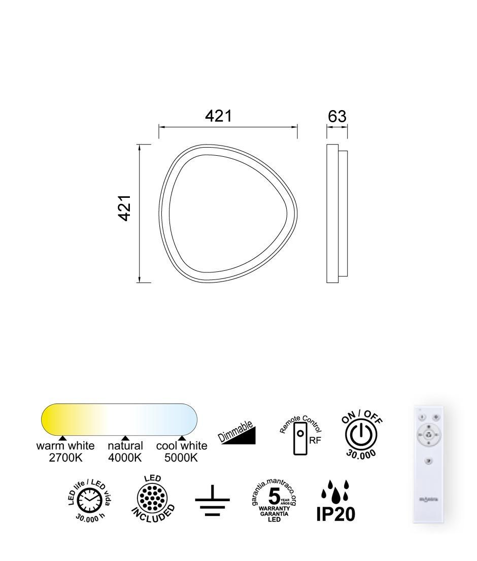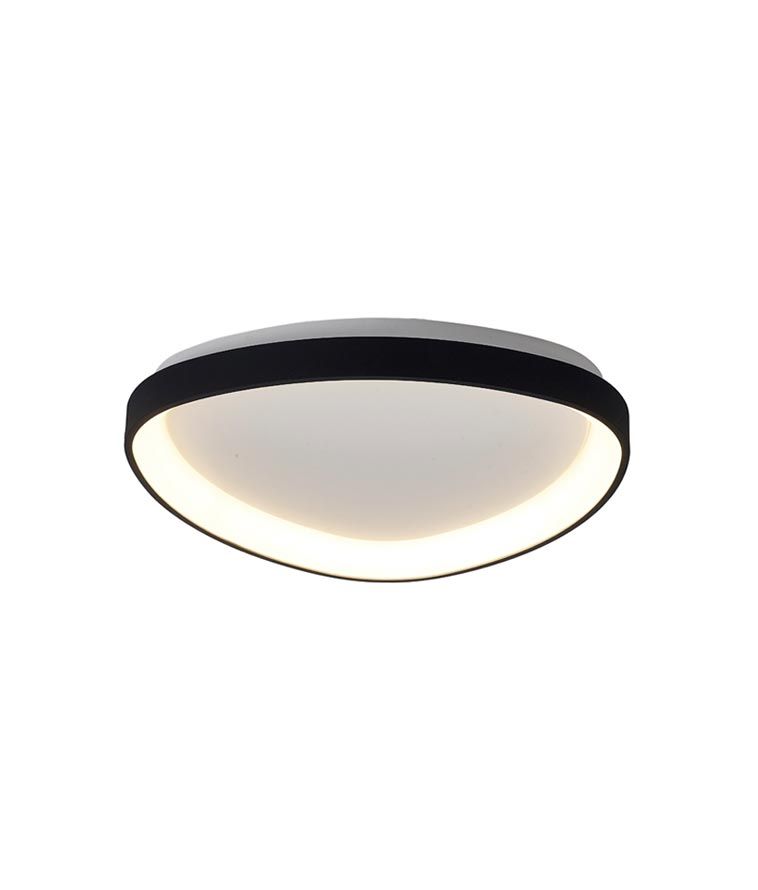 Plafón modelo Niseko II. Control mando a distancia. Acabado en color negro. Fabricado en acrílico y metal. Voltaje 220-240V y fuente de luz regulable en intensidad y tonalidad LED 38W 2700K-5000K 2500Lm (incluida).