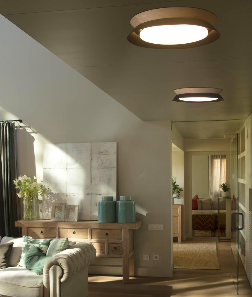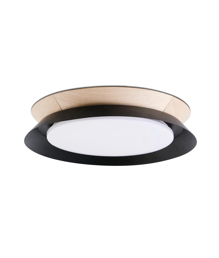 Lámpara de techo modelo TENDER LED. Ideal luminaria para interiores de diseño que proporciona luz uniforme. Acabado en color negro. Diseño estilo moderno con un aire nórdico. Fabricada en metal, madera y difusor de PMMA opal. Voltaje 220-240V y fuente de luz cálida LED 24W 3000K (incl.).