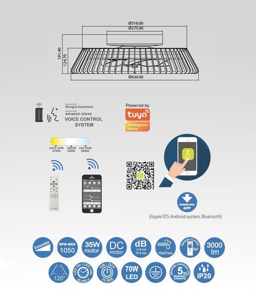 Lámpara con doble función de plafón y ventilador, modelo HIMALAYA. Ideal para espacios entre 13m2 y 22m2. Diseño moderno e inteligente que se puede controlar sus 6 velocidades con el mando a distancia, móvil o por control de voz con Google Assistant y Alexa amazon. Acabado en blanco. Fabricada con motor de bajo consumo DC en metal. 1050 RPM máximo. dB 41,8 mínimo y 51,8 máximo. 102 m3/min. Voltaje 200-240V y fuente de luz LED 70W dimable para tonalidad de variable entre 2700-5000K con 4900Lm (incluidas).