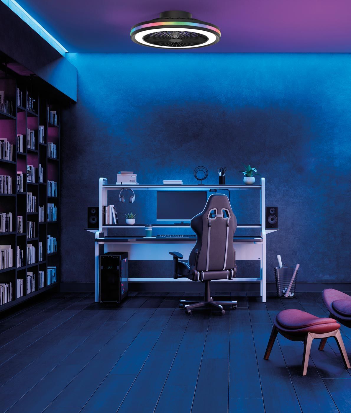 Lámpara con doble función de plafón y ventilador, modelo Gamer LED. Ideal para espacios hasta 13m2. Diseño moderno que se puede controlar sus velocidades con el mando a distancia incluido. Acabado en negro. Flujo de aire concentrado. Fabricada con motor de bajo consumo DC en metal y estructura en ABS. Voltaje 200-240V y fuente de luz LED 40W dimable para tonalidad de variable entre 2700-6000K con 3000Lm (incluida). Tira RGB Rainbow.