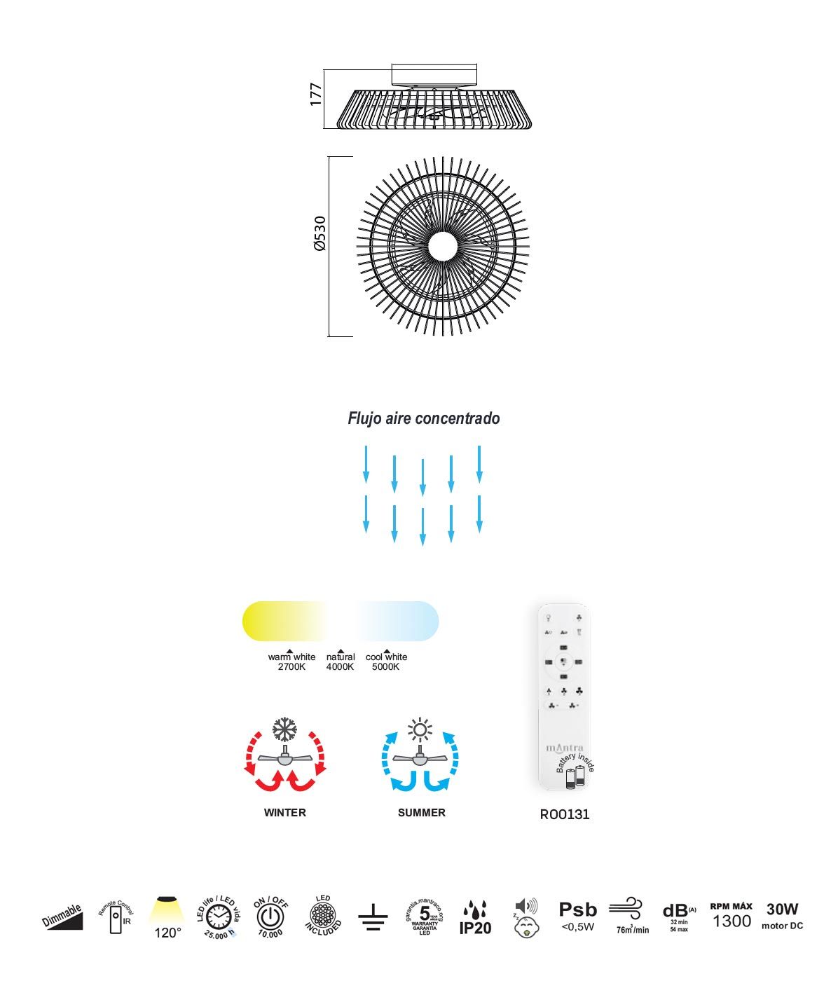 Lámpara con doble función de plafón y ventilador, modelo Himalaya Mini. Ideal para espacios de hasta 13m2. Diseño moderno que se puede controlar sus velocidades con el mando a distancia incluido. Acabado en negro. Flujo de aire concentrado. Fabricada con motor de bajo consumo DC en metal y estructura en ABS. 1300 RPM máximo. dB 32 mínimo y 54 máximo. 76 m3/min. Voltaje 200-240V y fuente de luz LED 70W dimable para tonalidad de variable entre 2700-5000K con 3700Lm (incluida).
