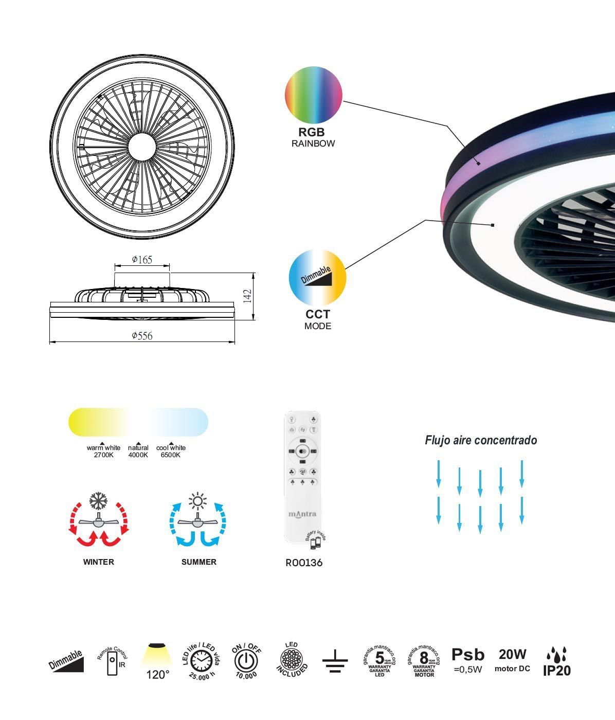 Lámpara plafón con doble función de plafón y ventilador, modelo Gamer LED. Ideal para espacios hasta 17m2. Diseño moderno que se puede controlar sus velocidades con el mando a distancia incluido. Acabado en negro. Flujo de aire concentrado. Fabricada con motor de bajo consumo DC 26W en metal y estructura en ABS. Voltaje 200-240V y fuente de luz LED 60W dimable para tonalidad de variable entre 2700-6000K con 4200Lm (incluida). Tira RGB Rainbow.