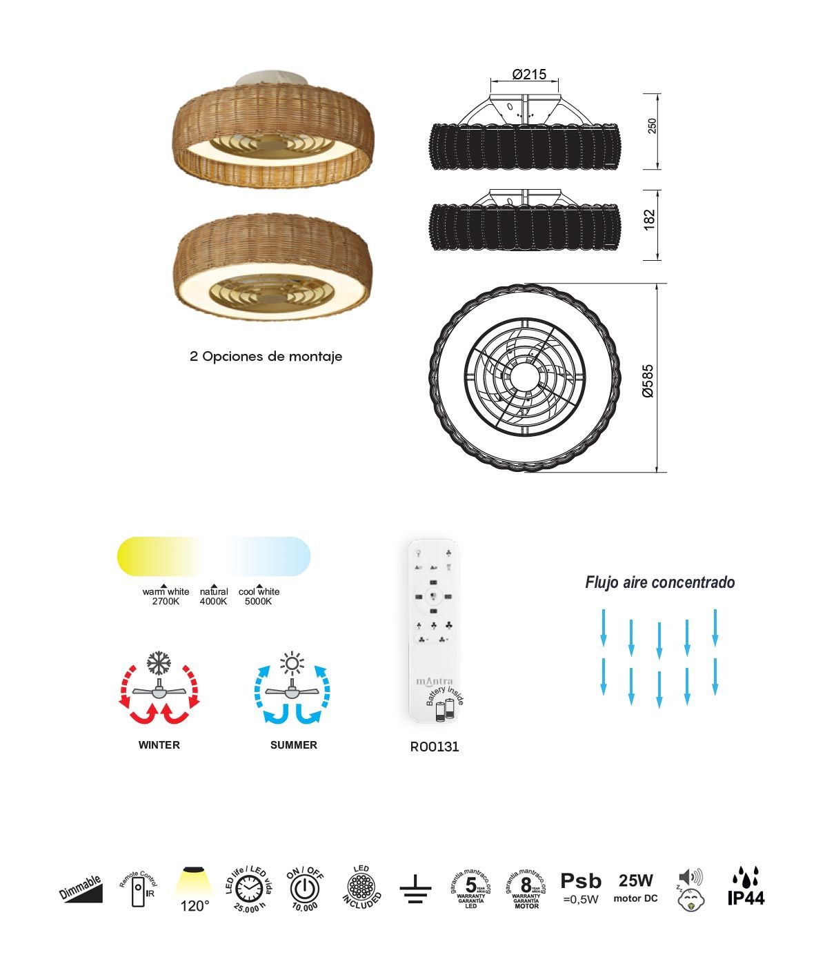 Lámpara con doble función de plafón y ventilador, modelo Kilimanjaro Mini. AVISO COLOR: Al ser material natural puede variar su color final, mirar la tercera fotografía de referencia. Protección IP44 también para uso exterior. Ideal para espacios de hasta 13m2. Diseño estilo rústico que se puede controlar sus velocidades con el mando a distancia incluido. Acabado en blanco y ratán. Flujo de aire concentrado. Fabricada con motor de bajo consumo DC en metal y estructura en ratán. Voltaje 200-240V y fuente de luz LED 55W dimable para tonalidad de variable entre 2700-5000K con 3800Lm (incluida).