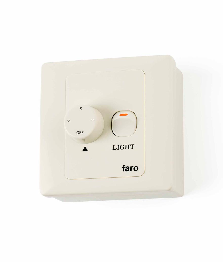 Regulador de pared para ventiladores de techo de la marca FARO. Fabricado en ABS con tres velocidades e incorpora encendido y apagado de luz. Válido para todos los ventiladores FARO, excepto los de motor DC.
