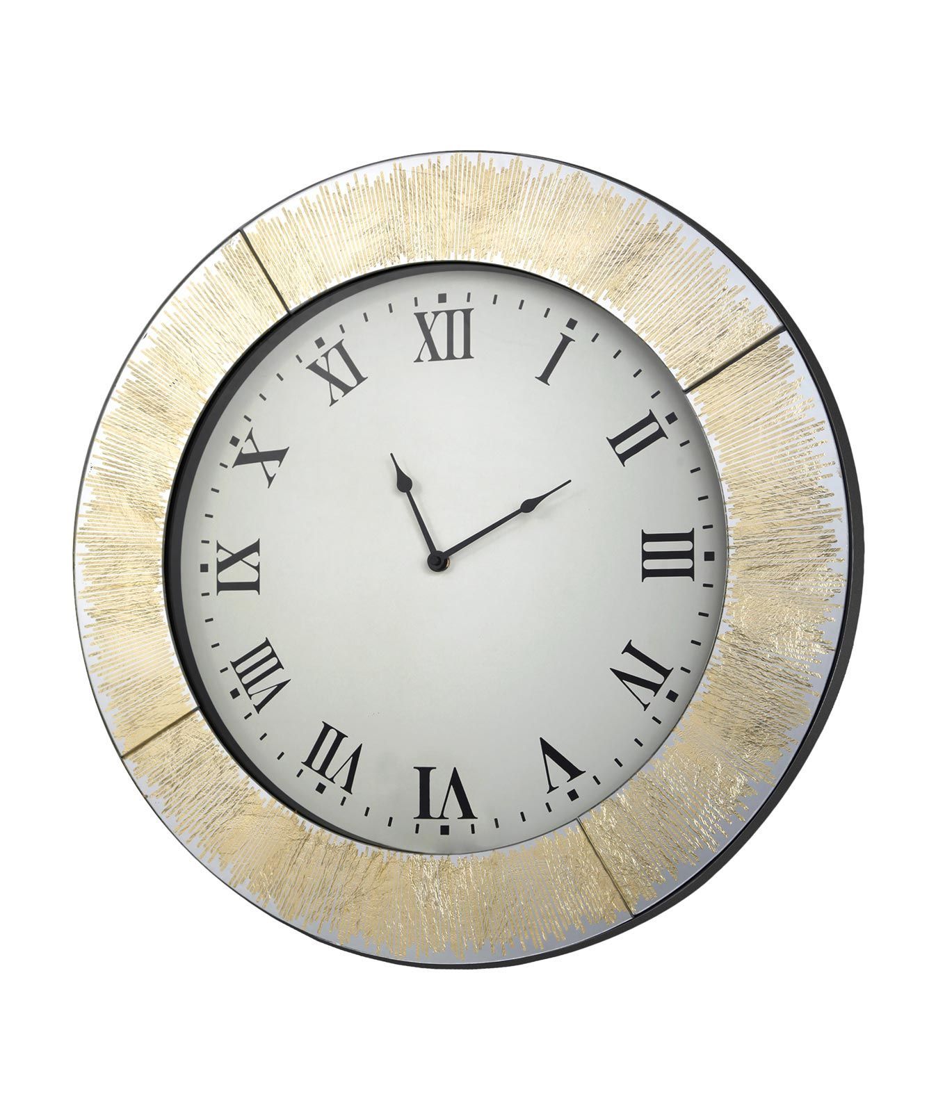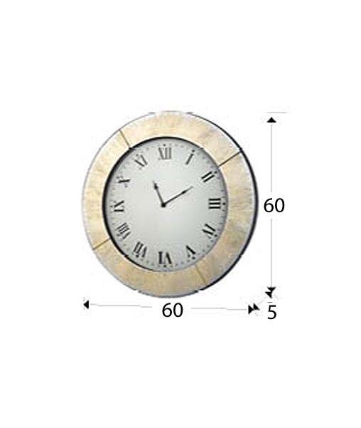 Reloj redondo con marco de espejo con grafismo en pan de oro, esfera impresa. Trasera de DM lacado en negro. Pila AA no incluida.