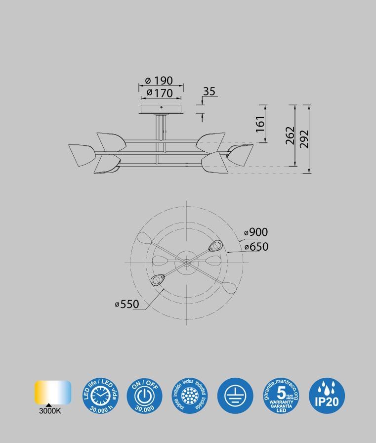 Semiplafón modelo CAPUCCINA LED. Ideal para la iluminación decorativa. Acabado en color blanco. Fabricada en metal y aluminio. Voltaje 220-240V y fuente de luz cálida LED de 45W 3000K 3200Lm (incluida).