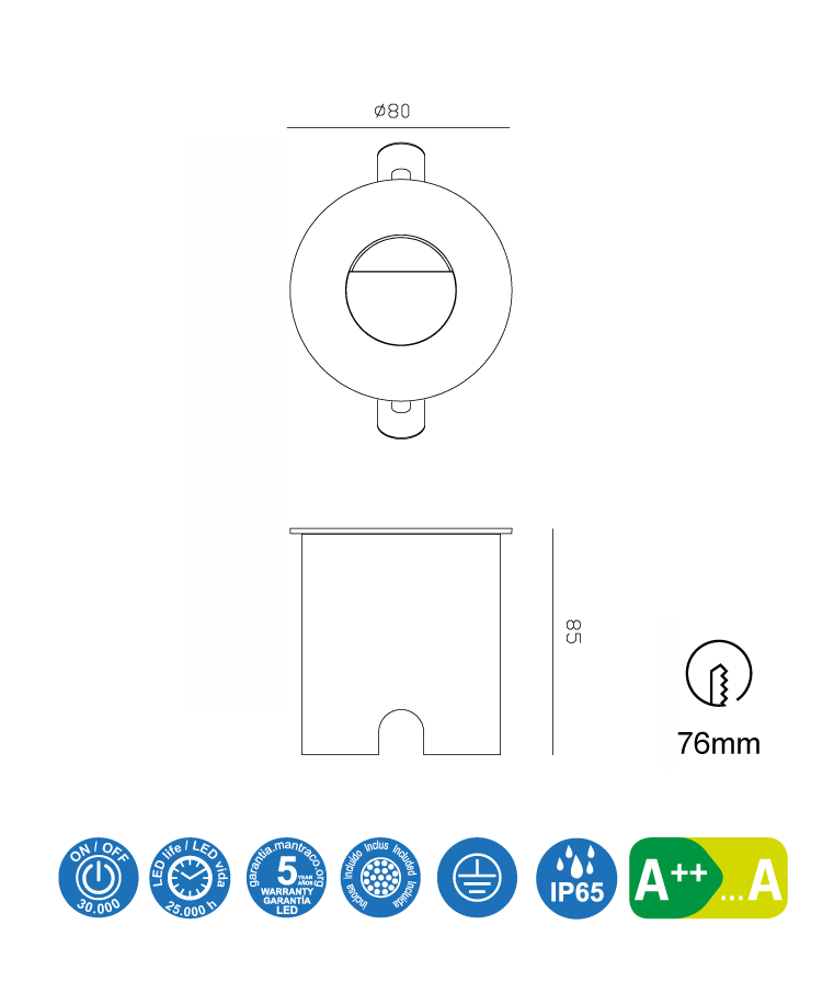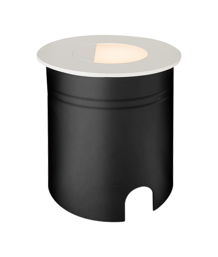 Señalizador empotrable circular exterior con alta protección IP65, modelo ASPEN II. Acabado en color blanco arena. Ideal para señalizar los espacios de exterior. Fabricada en aluminio. Voltaje 200-240V y fuente de luz cálida LED de 3W 3000K (incl.).