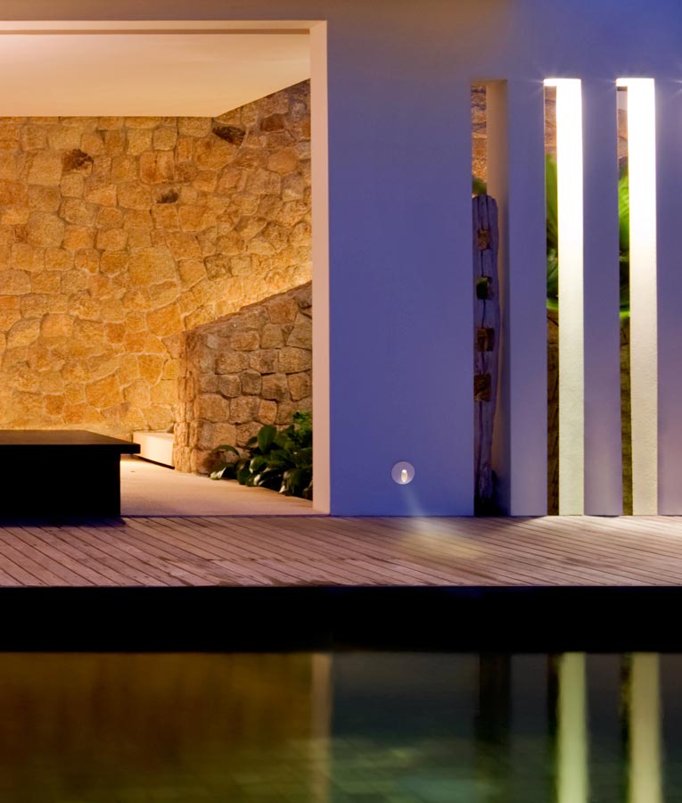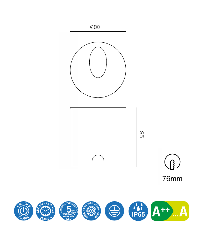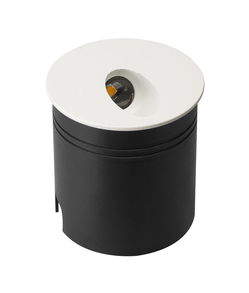 Señalizador empotrable circular exterior con alta protección IP65, modelo ASPEN. Acabado en color blanco arena. Ideal para señalizar los espacios de exterior. Fabricada en aluminio. Voltaje 200-240V y fuente de luz cálida LED de 3W 3000K (incl.).