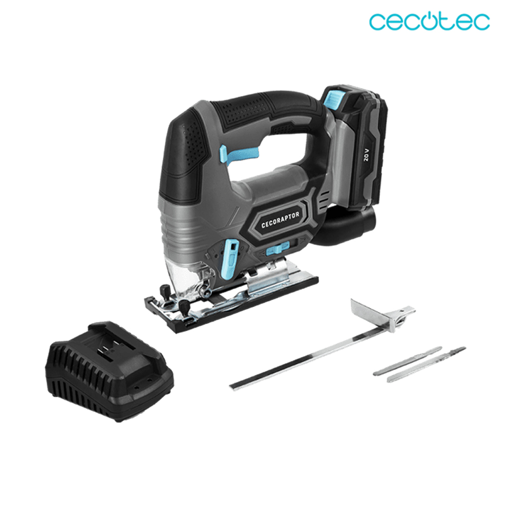 Sierra de calar sin cables, con batería de 20 V y 2000 mAh, velocidad sin carga de 2700 rpm, profundidad de corte de 80 mm en madera, de 12 mm en aluminio y de 5 mm en metal; longitud de carrera de 20 mm, ángulo de ajuste de ± 45º, luz de trabajo LED incorporada y autonomía de hasta 20 minutos.