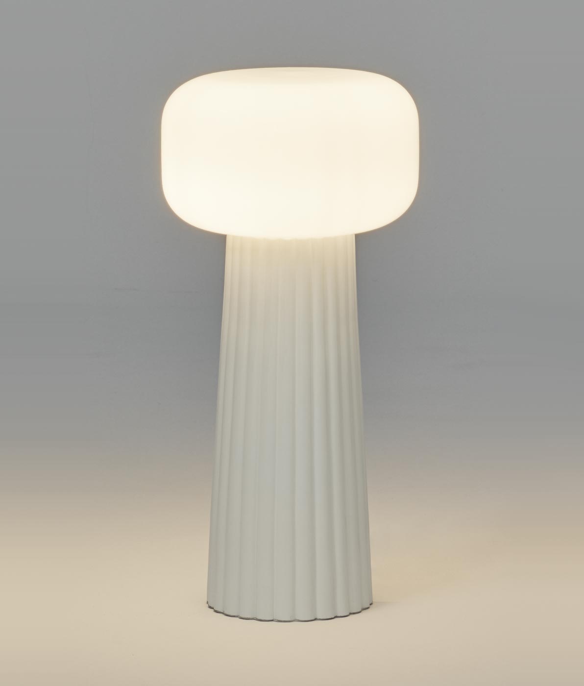 Sobremesa de diseño moderno, modelo FARO. Acabado en blanco. Fabricada en policarbonato y tulipa de cristal opal. Voltaje 100-240V y fuente de luz por una bombilla E27 MÁX 20W LED (no incluida).