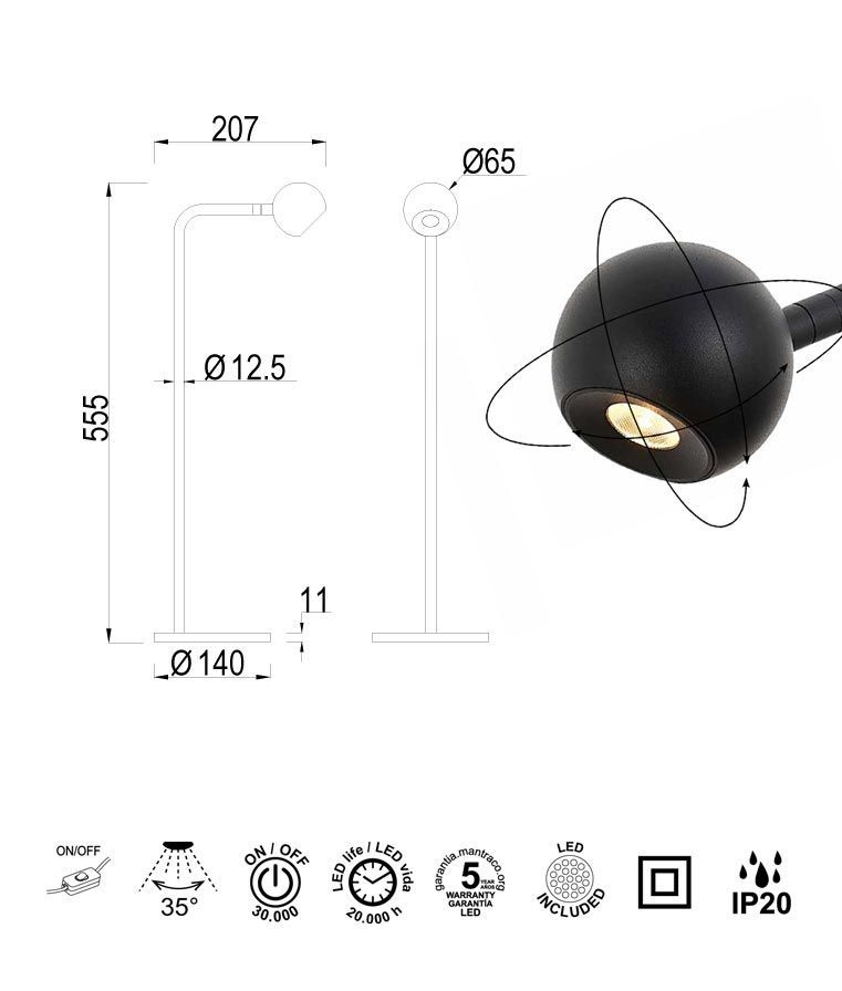 Sobremesa ideal para la iluminación decorativa del salón o dormitorio, modelo EYES LED. Acabado en negro. Fabricada en aluminio. Voltaje 100-240V y fuente de luz cálida LED 6W 3000K 390Lm (incluida).