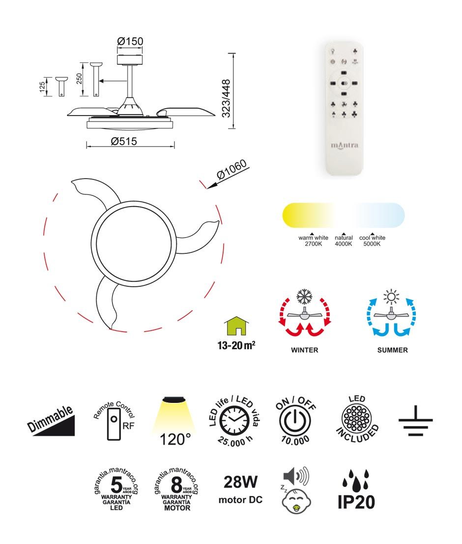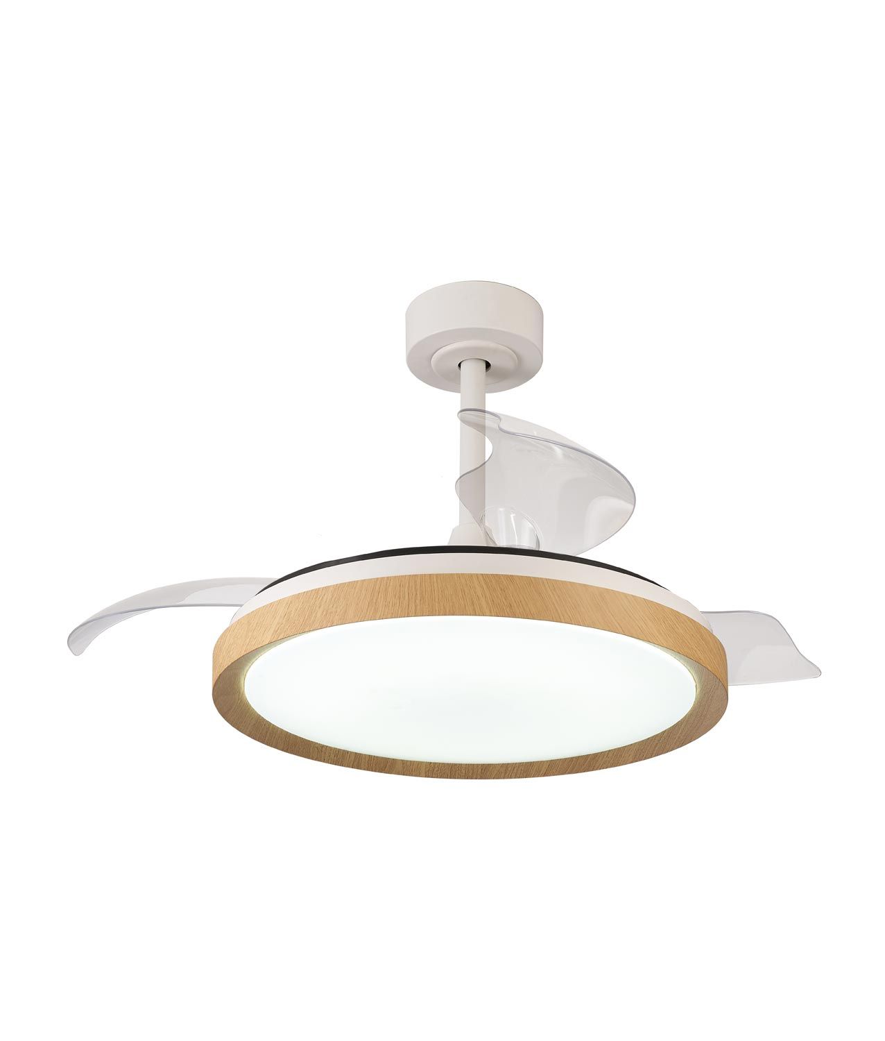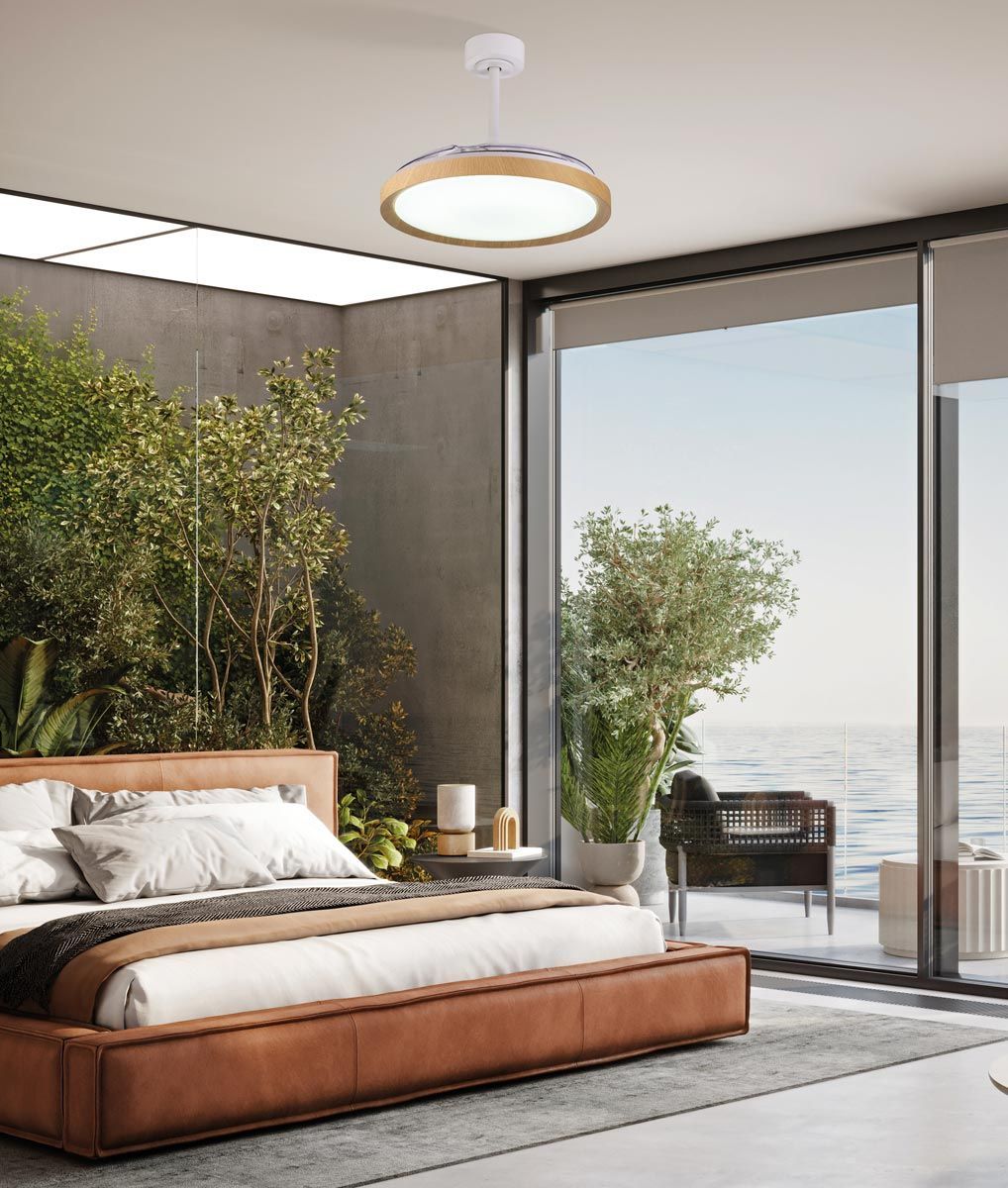 Ventilador de techo y plafón modelo Mistral. Ideal para espacios entre 13 y 20m2. Aspas desplegables. Diseño moderno que se puede controlar sus velocidades con el mando a distancia incluido. Acabado en blanco y simulación madera. Flujo de aire amplio. Fabricada con motor de bajo consumo DC en metal y estructura en ABS. Voltaje 220-240V y fuente de luz LED 50W dimable y tonalidad variable entre 2700-5000K con 3200Lm (incluida). Función inversa verano/invierno.